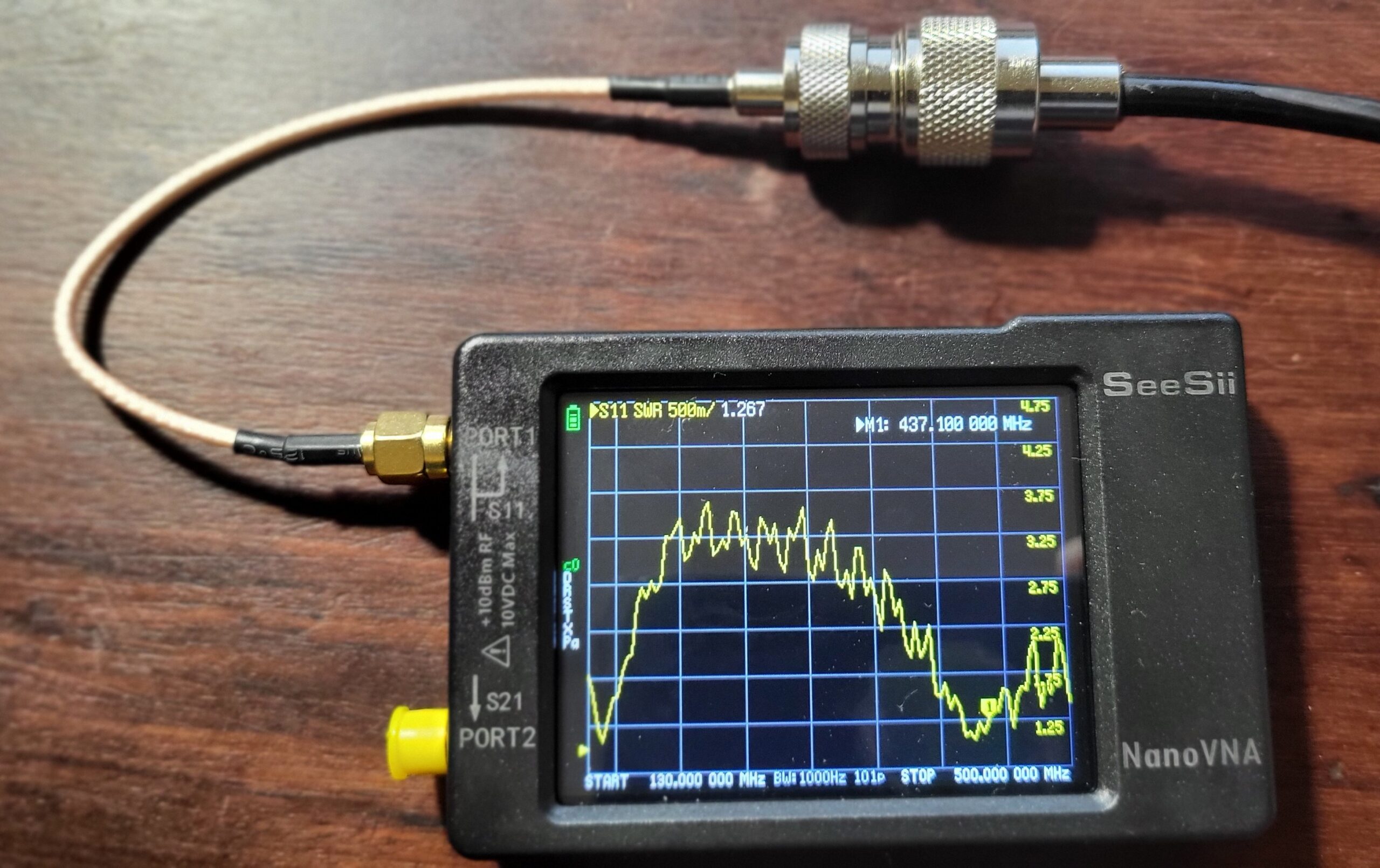 - Conectamos la antena y medimos. Ahora ya solo queda conectar la antena al puerto 1 que viene marcado como «S11» y ya está. Para poder saber la relación de ondas estacionarias para una determinada frecuencia solo tenemos que movernos con la gráfica con la rueda que hay en la parte superior del NanoVNA.