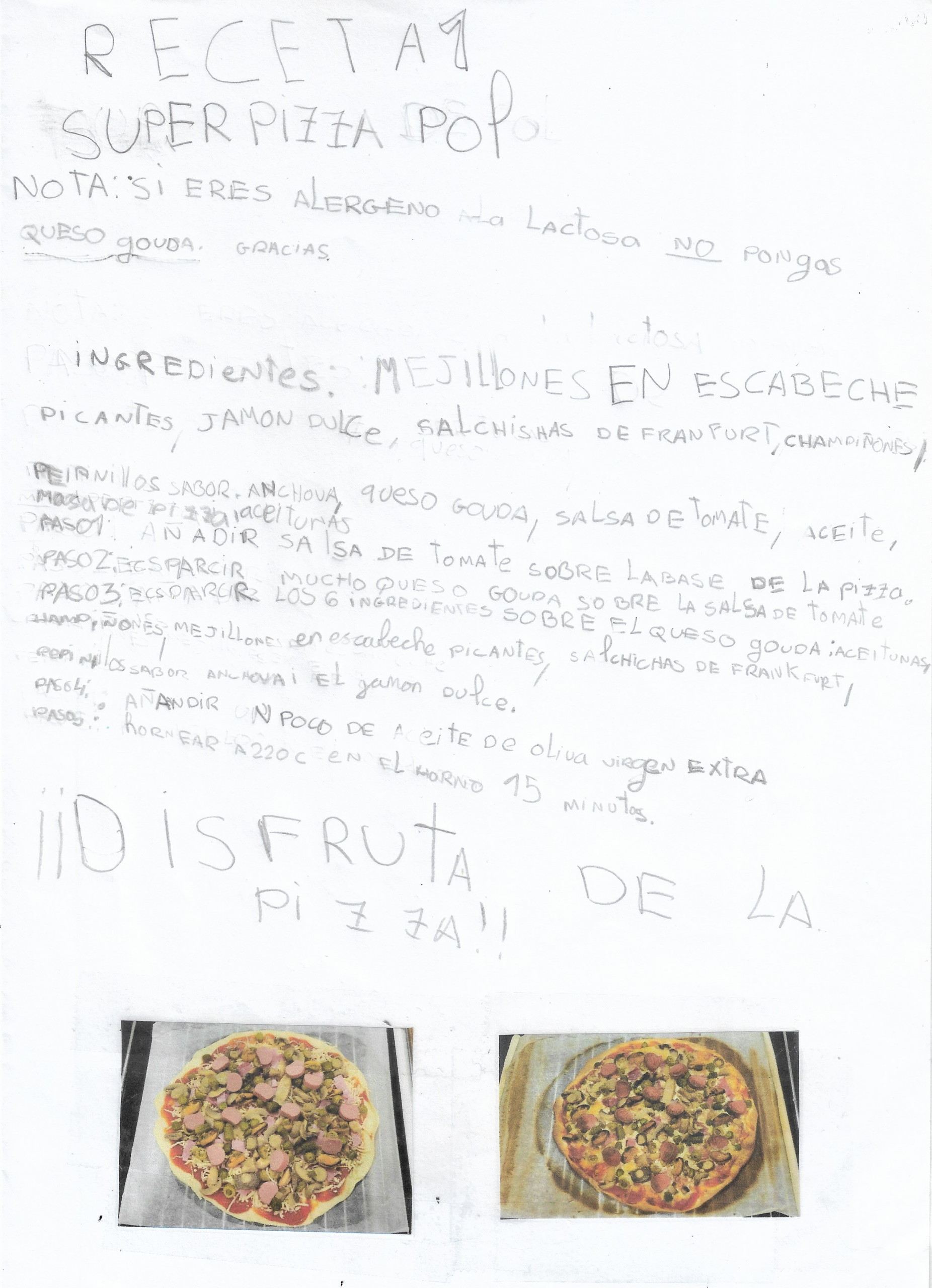 Ayer publiqué la receta de la Super Pizza Pol que inventamos con él para cenar. Como que no quiso que quedara en el olvido, Pol la escribió en un papel A3 doblado por la mitad para poder recordarla y hacerla otra vez.