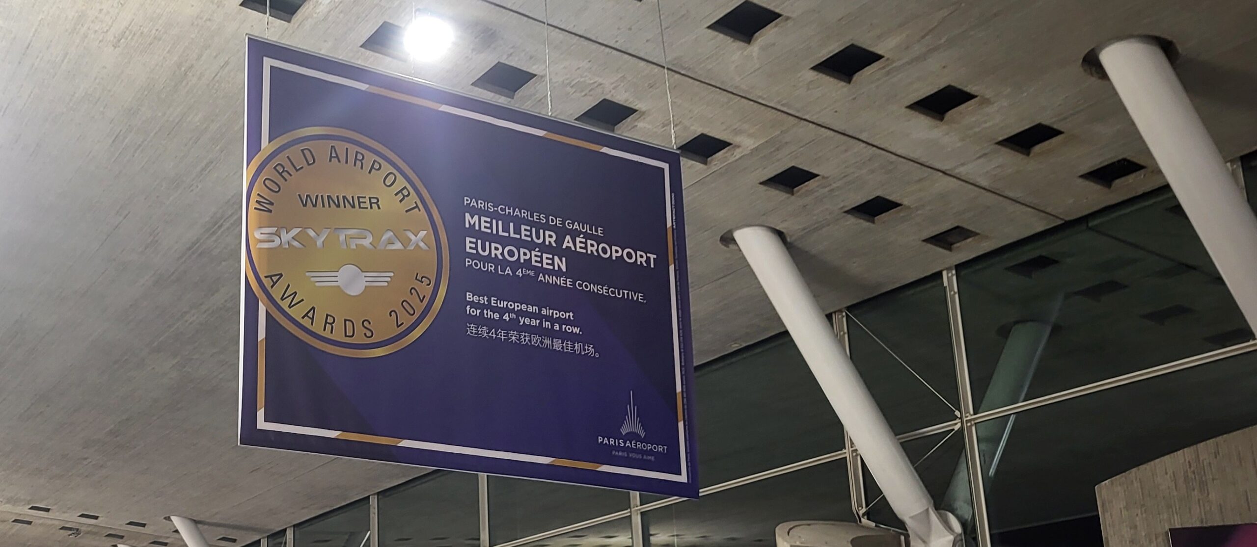 Pues bien, esta mañana que andaba desgraciadamente por Charles de Gaulle me he topado con este cartel gigante colgado del techo: