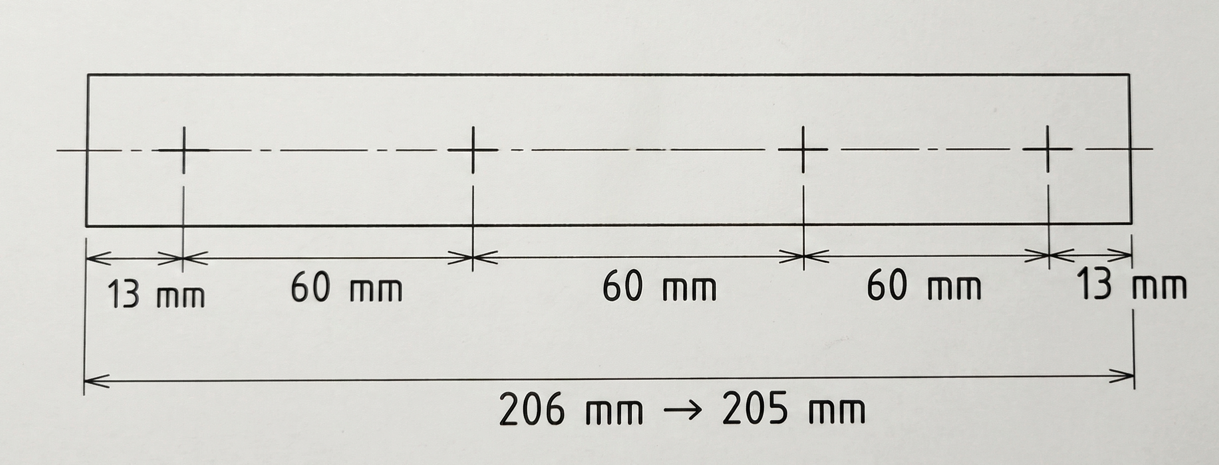 Al final me he comprado una lámina de aluminio de 100cms x 3cms en un chino por unos 6€, la he cortado en cuatro partes de 20,6cms y le he hecho 4 agujeros. Este es el plano que me he hecho para poder medir los agujeros (ya se que graficamente no es perfecto, pero me ha servido para poder aplicar medidas).